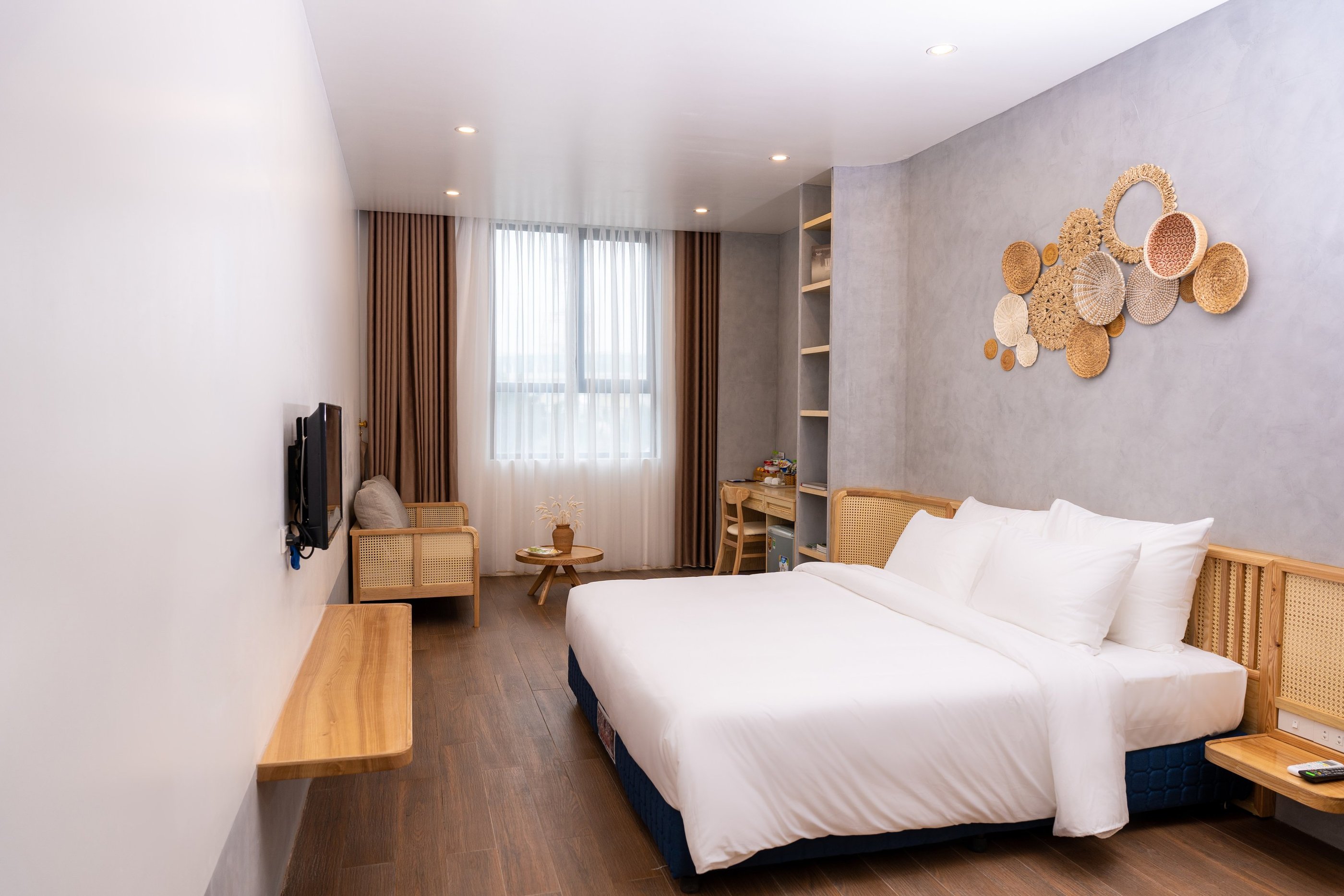 Sự kết hợp với các sản phẩm mây tre đan truyền thống tạo nên không gian sang trọng mà vẫn gần gũi.