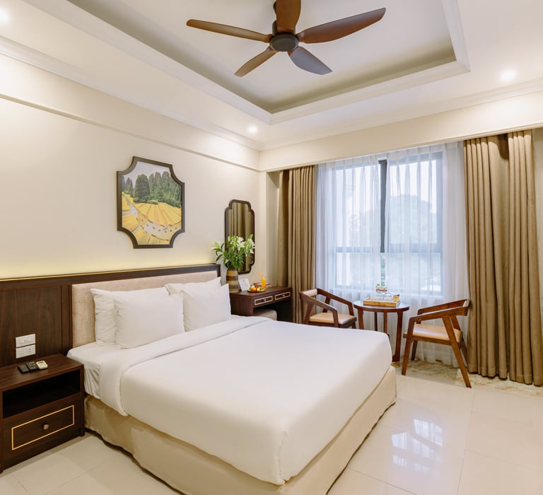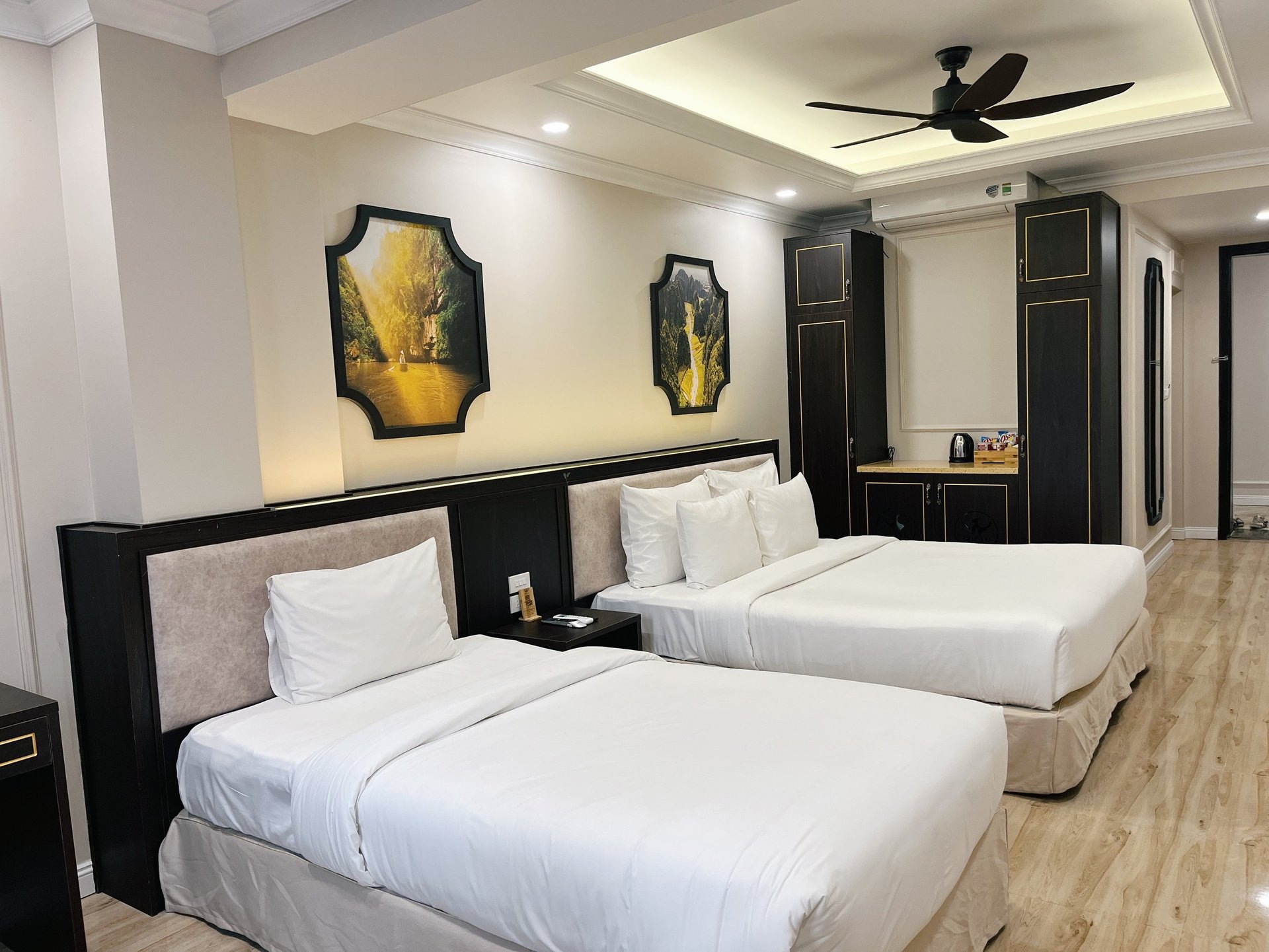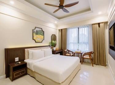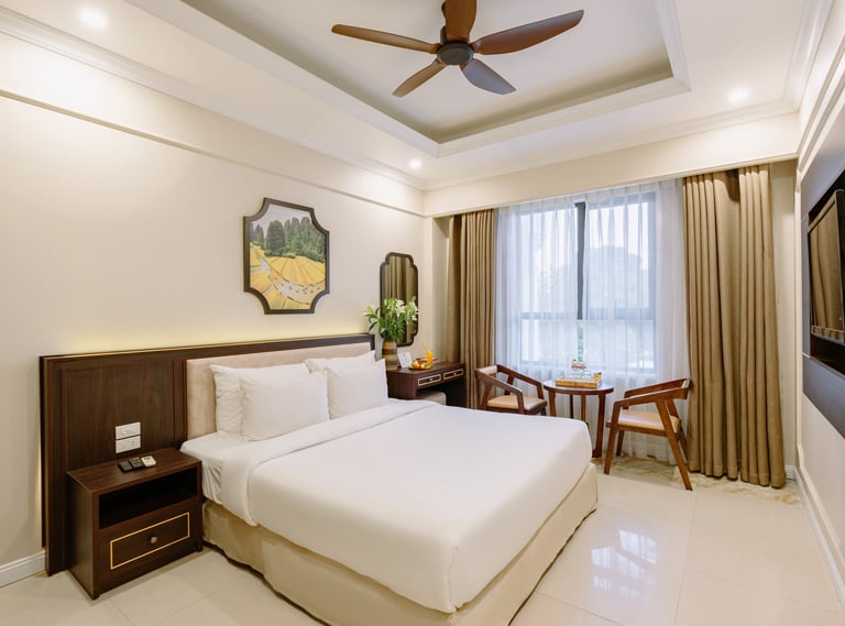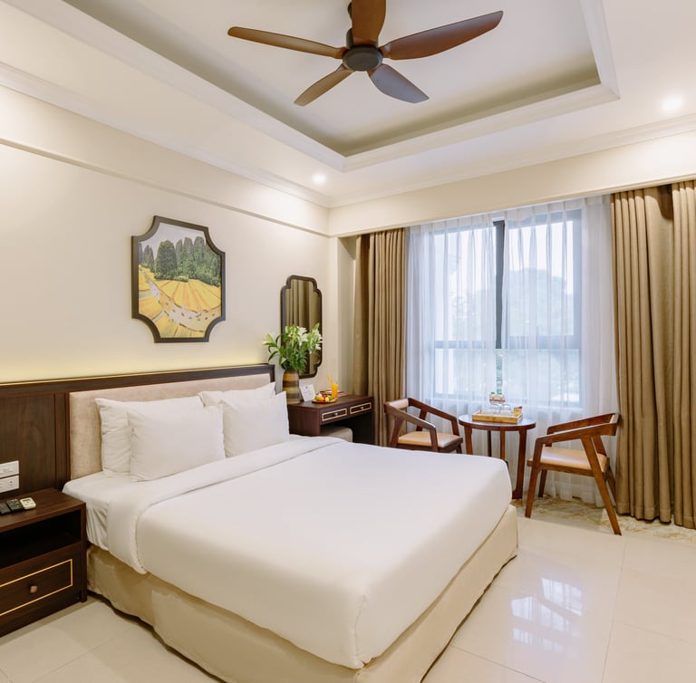 Phòng deluxe double của khách sạn mang đến cho du khách một không gian nghỉ ngơi sang trọng và thoải mái. Được thiết kế tinh tế, kết hợp giữa nội thất hiện đại và những chi tiết truyền thống. Đây là lựa chọn hoàn hảo cho những ai muốn tận hưởng kỳ nghỉ trọn vẹn.