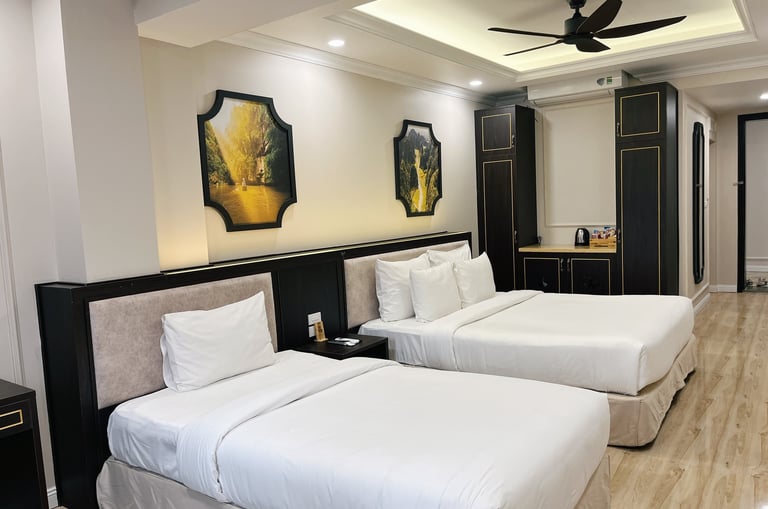Phòng VIP Family tại khách sạn được thiết kế nhằm mang đến sự thoải mái và tiện nghi cho các gia đình. Với không gian rộng rãi, phòng được trang bị 2 giường ngủ kết hợp với nội thất hiện đại và ấm cúng,